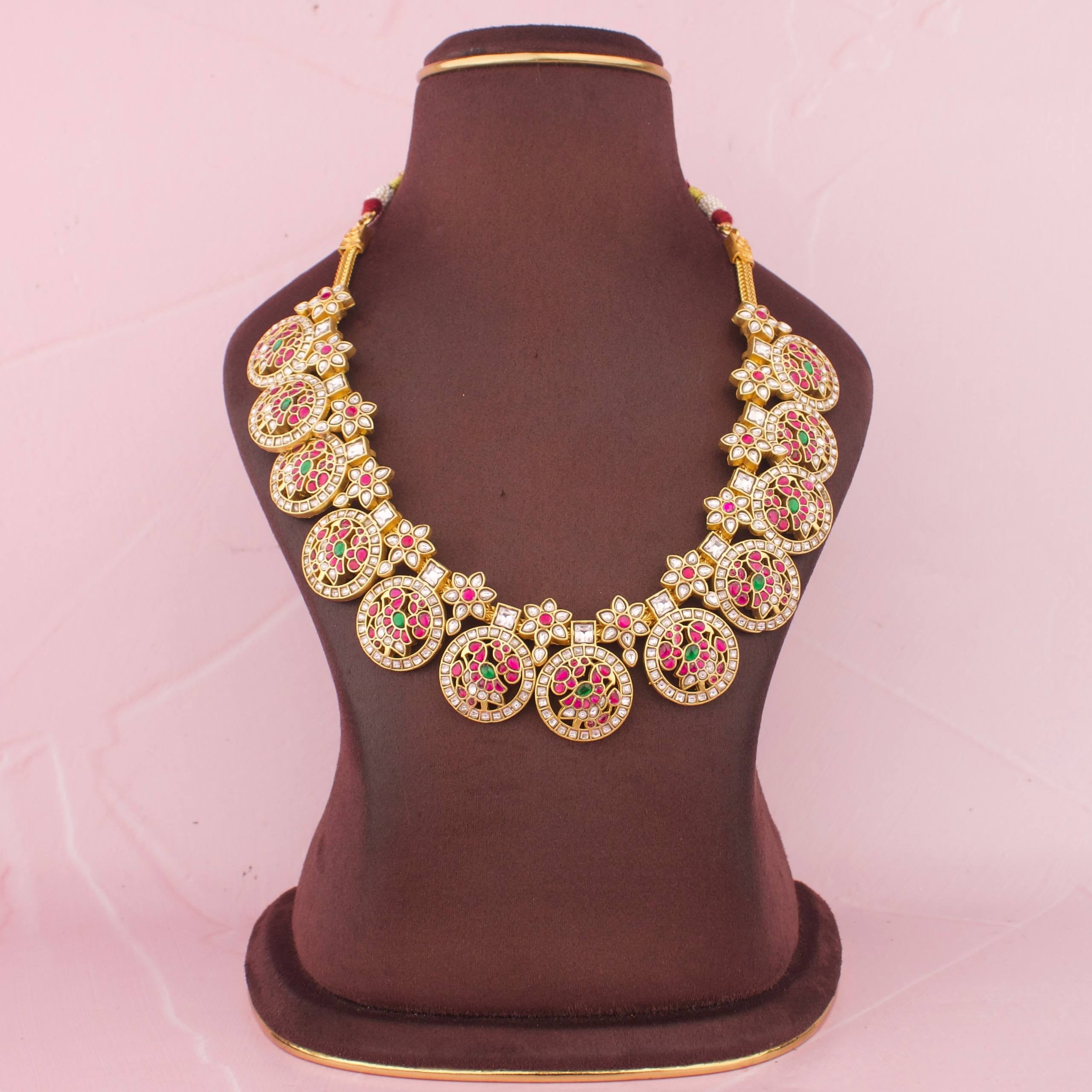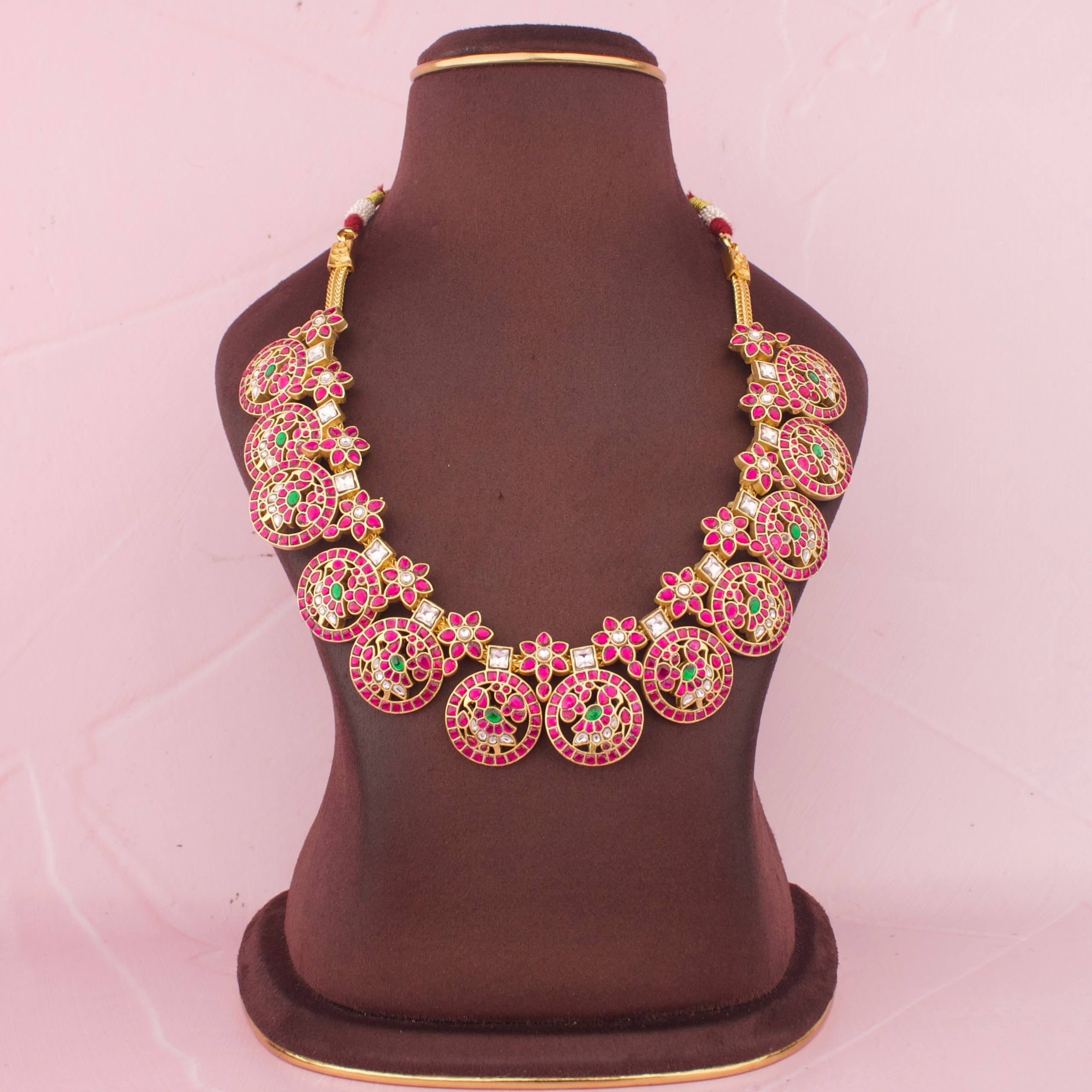 Peacock Design Nantad Chain Necklace With Ruby Stones And Green BeadsPeacock Design Nantad Chain Necklace With Ruby Stones And Green Beads