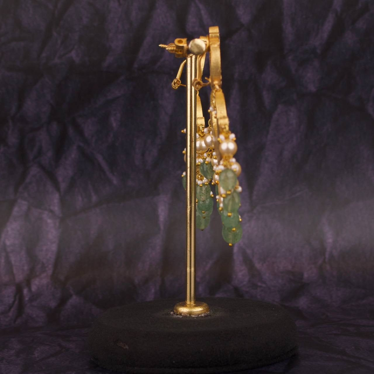 With traditional Jadau Kundan craftsmanship and a dramatic Chandbali outline, these earrings capture a regal aura that photographs beautifully. They pair effortlessly with both traditional and contemporary ensembles. Pearls and bead hangings catch the light from every angle, making them a versatile choice for both gold-toned bridal palettes and contemporary lehenga tones.