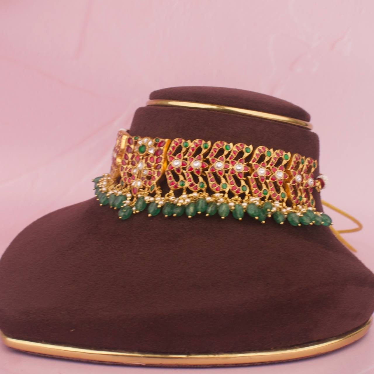 Bridal Neck Cover Jadau Kundan Choker Made In Pure 925 Silver With Strawberry Beads As Hangings