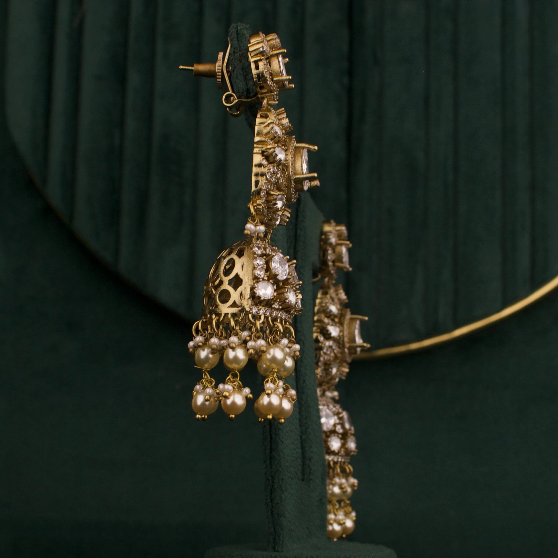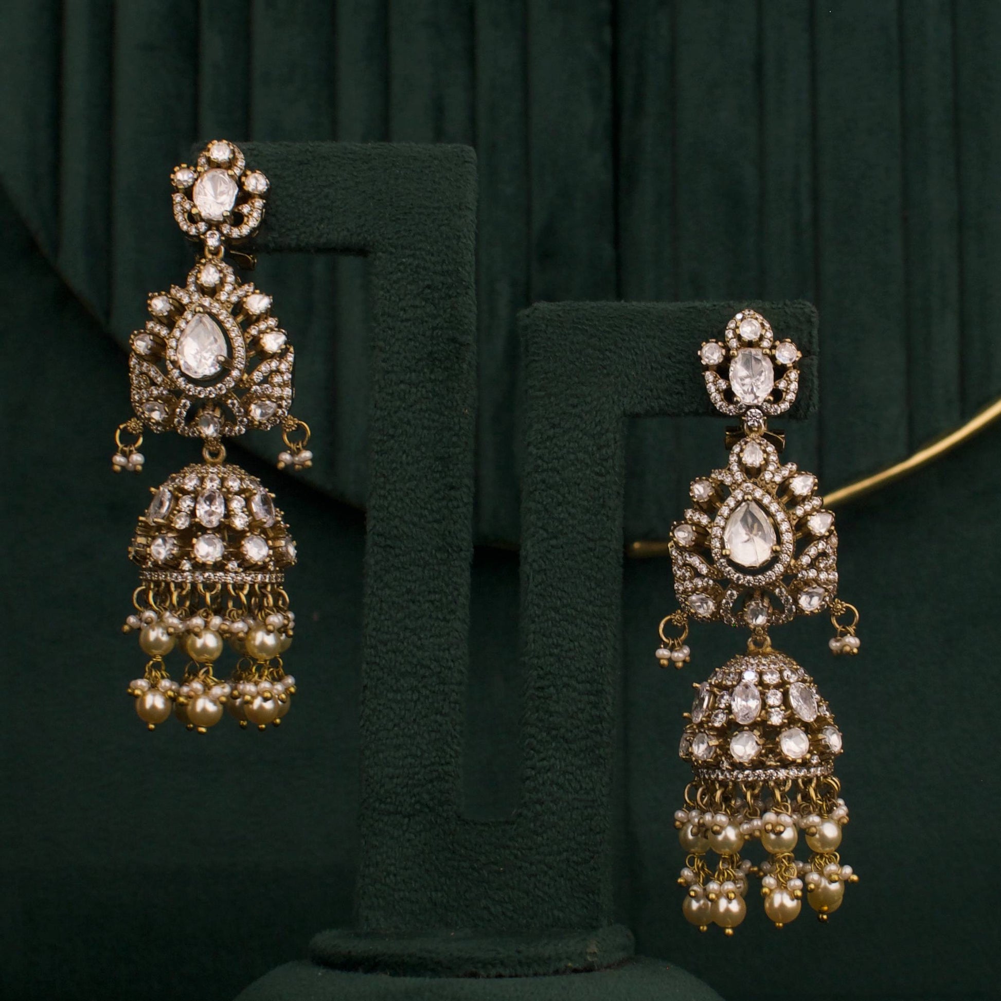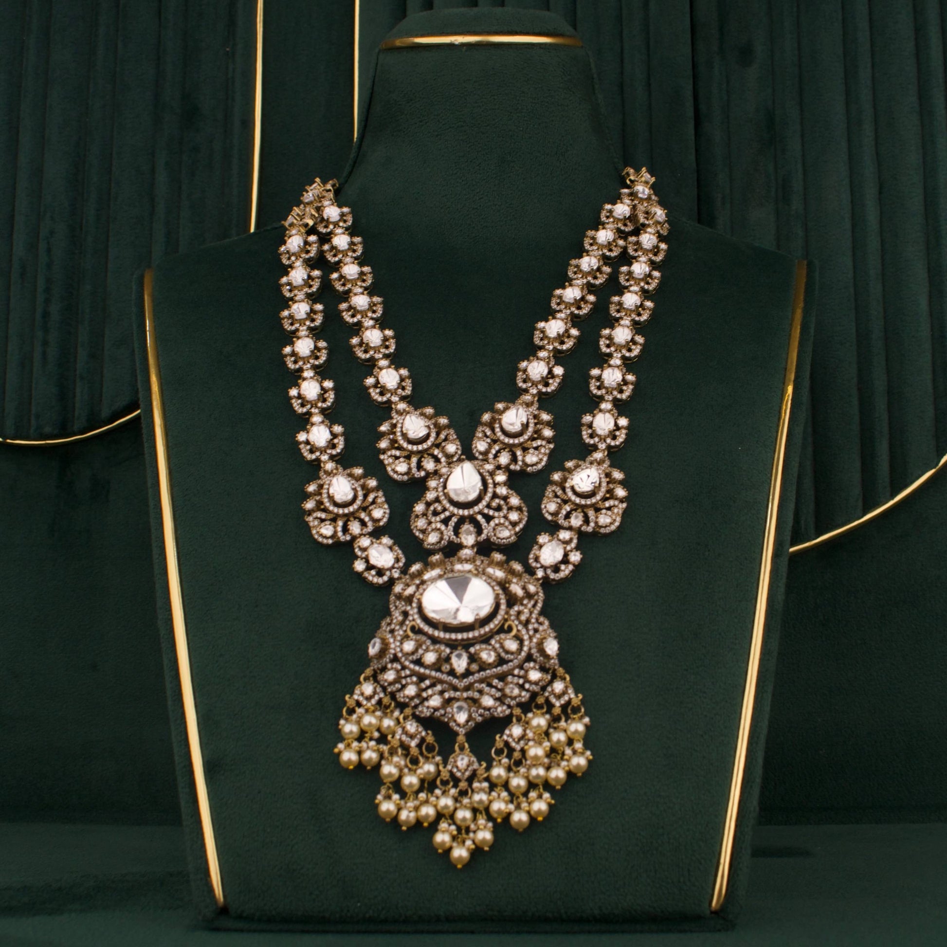 Introducing the Bridal Victorian Layer Polki Haram with Matching Jhumki — a bridal jewelry set that blends antique charm with modern brilliance. Crafted for brides who want a statement piece that elevates traditional attire, this layered Polki haram necklace is paired with coordinating jhumki earrings for a balanced, radiant look.