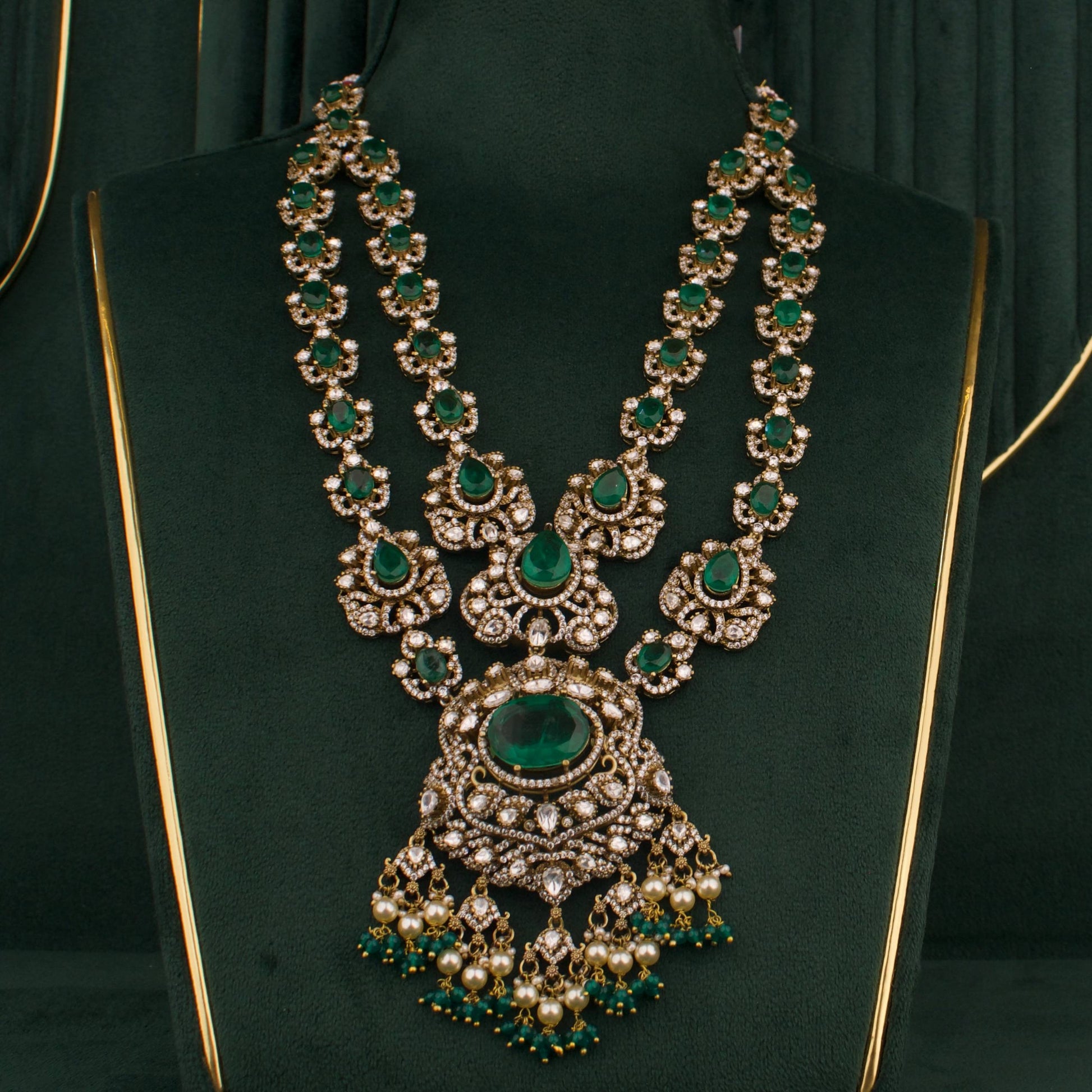 - Victorian-inspired layered haram necklace with multiple strands that create a regal neckline on lehenga or saree silhouettes.