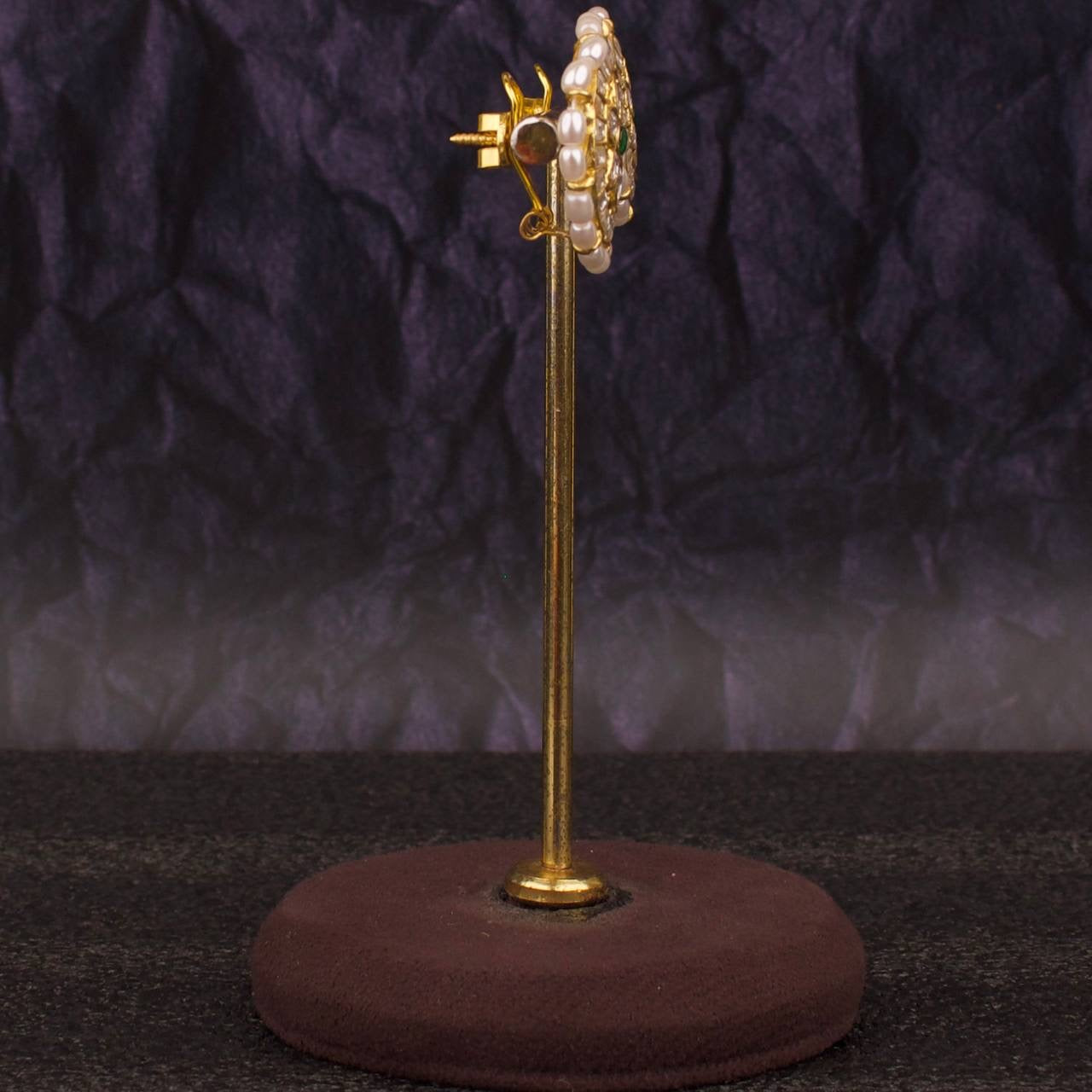 Elevate your traditional ensembles with Circular Floral Design Jadau Kundan Stud Earrings With Pearl Bordering—an exquisite pair crafted for women who value timeless craftsmanship. This earring blends a circular floral motif, a classic Jadau Kundan setting, and a delicate pearl border for a refined finish.