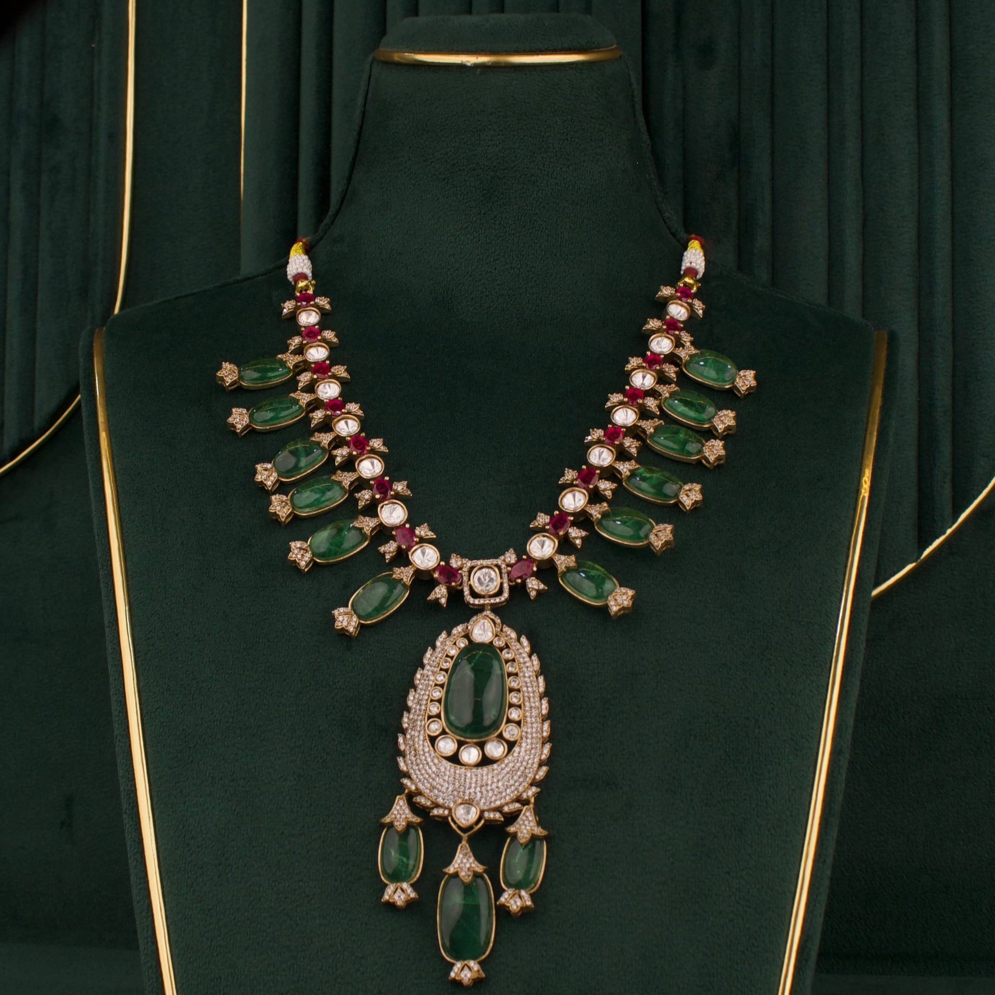 The emerald-polki combination creates a vintage glow that photographs beautifully under stage lighting and candlelit receptions. This necklace set adds a regal touch to bridal attire—whether paired with a silk saree, a richly embroidered lehenga, or a sleek evening gown—without overpowering the wearer. The design is balanced to flatter different necklines and facial shapes, allowing you to feel poised and confident from ceremony to celebration.
