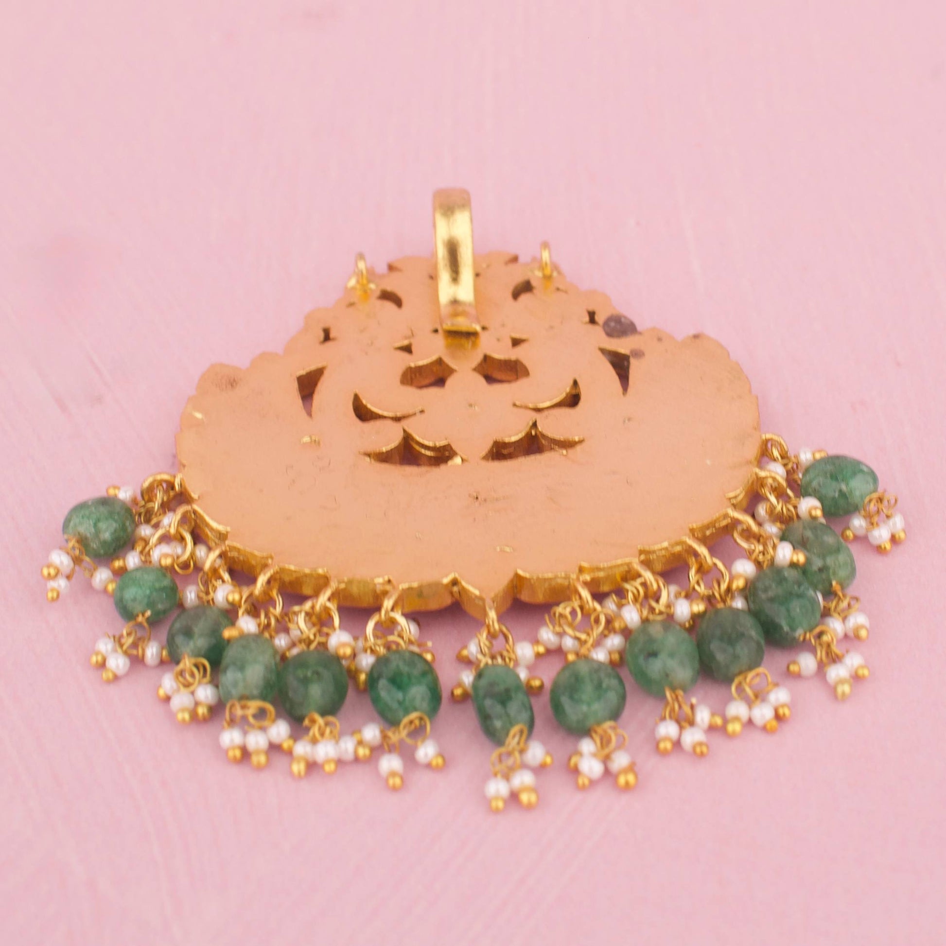 Crafted in the venerable jadau kundan tradition, the pendant features meticulously set ruby stones that catch the light from every angle. The ruby work is complemented by vibrant green strawberry bead hangings, which add a contemporary twist while preserving the opulent heritage of Indian jewelry.
