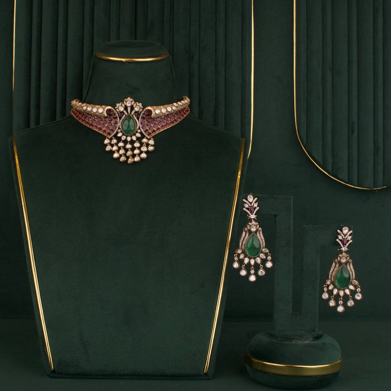 Designer Victorian Finish Polki Choker Set With Earrings is a timeless fusion of antique charm and modern sparkle. This jewellery set highlights intricate Polki stones arranged in a regal choker that sits gracefully on the collarbone, complemented by matching earrings.