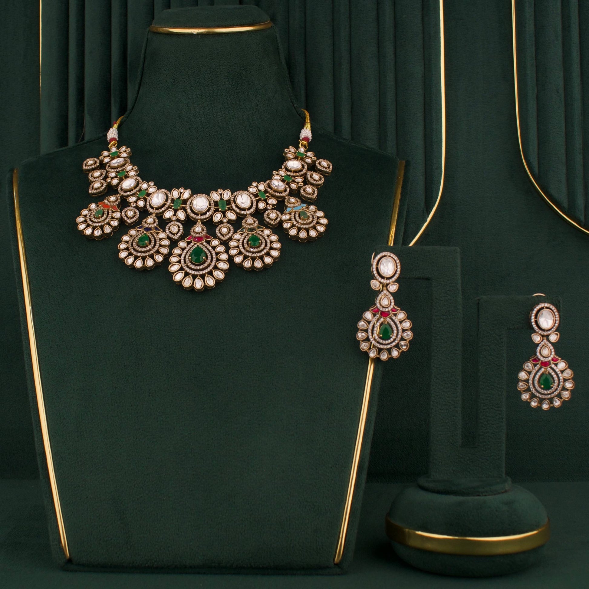 - Classic Polki design crafted to sit gracefully along the collarbone and frame the face for an elegant silhouette.
