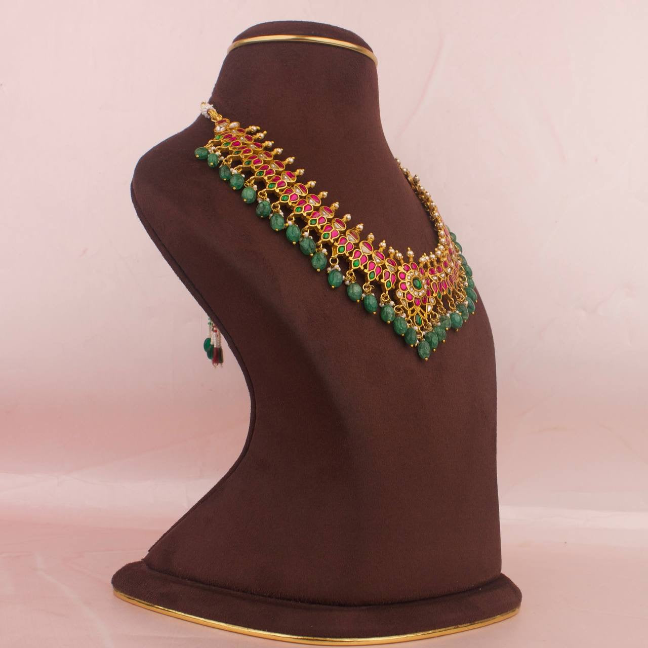 Discover the Floral Centre Jadau Kundan Necklace, a stunning example of traditional Indian jewelry. This piece centers a radiant floral motif, showcases expert Jadau (Kundan) craftsmanship, and is accented with strawberry bead hangings that gleam with every movement. Designed to elevate bridal and festive ensembles, it blends antique charm with contemporary presence, making it a versatile centerpiece for weddings, receptions, and celebrations.
