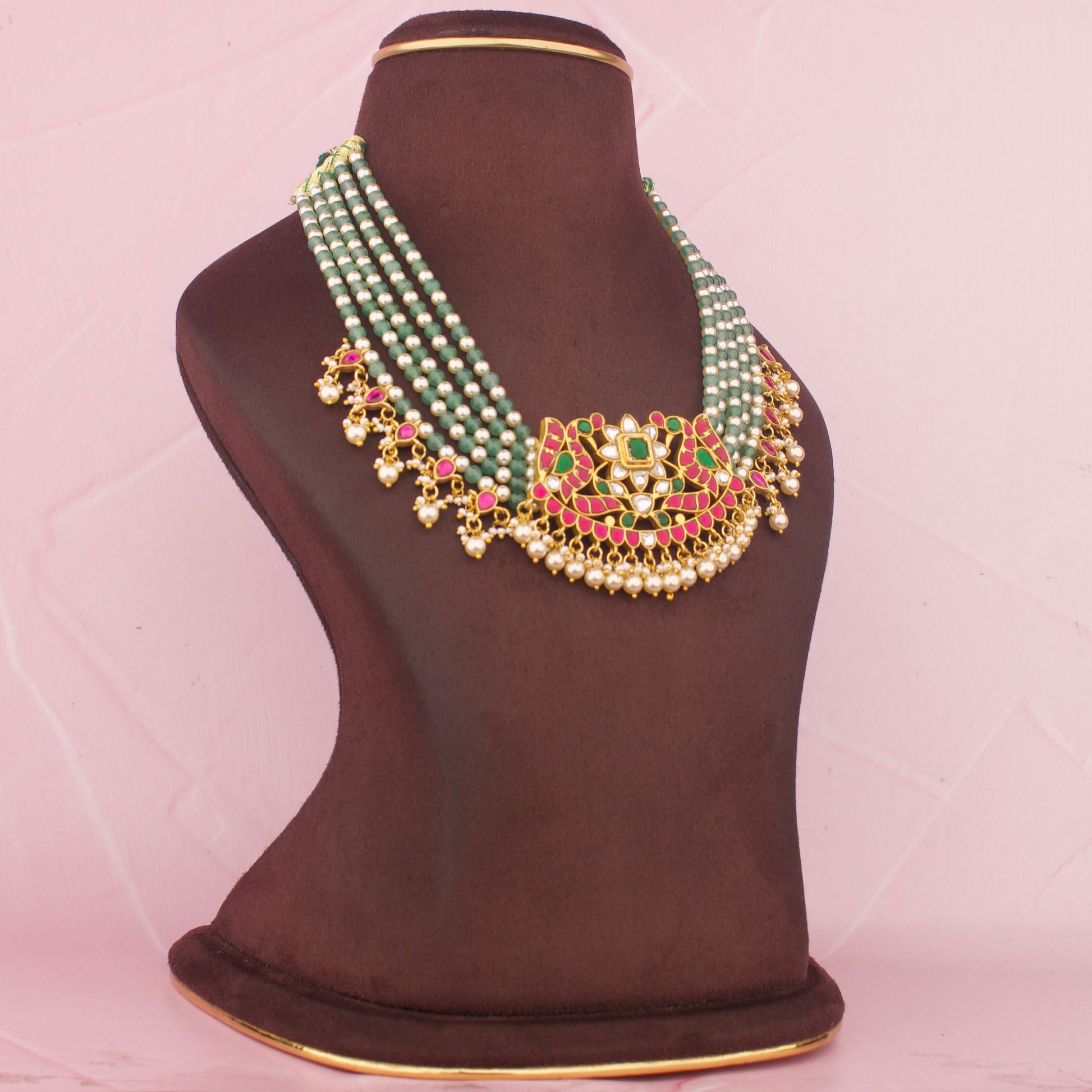 A: Let the pearl and kundan hues guide your color palette. Rich jewel tones (emerald, ruby, sapphire) pair especially well, while ivory or champagne outfits let the piece take center stage.
