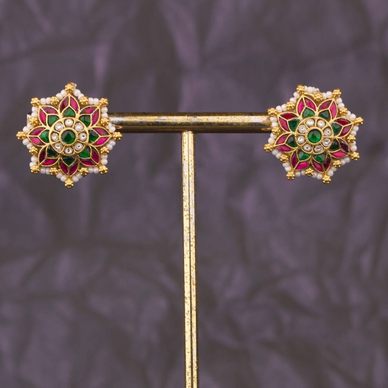 Floral Jadau Kundan Stud Earrings With Pearl Detailing