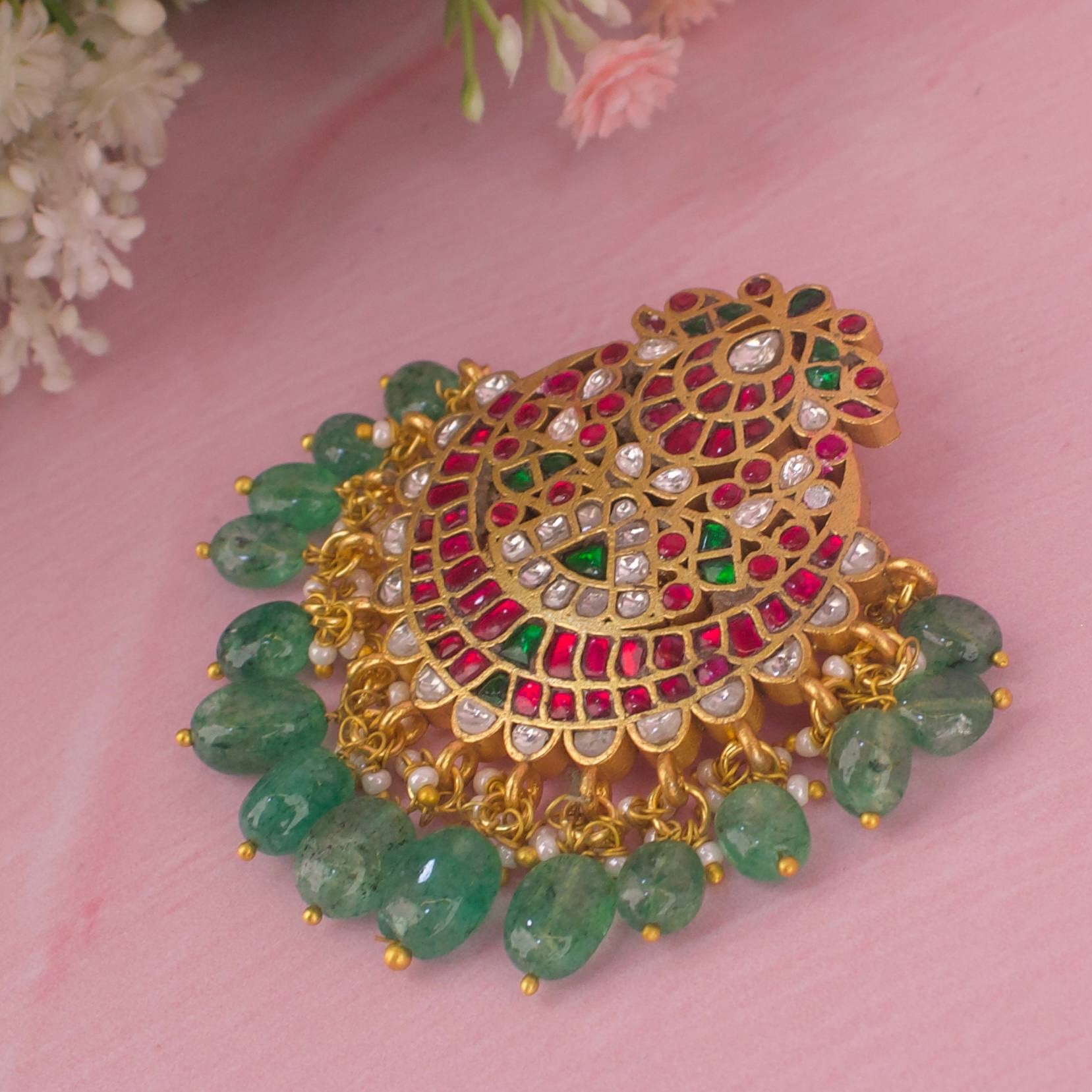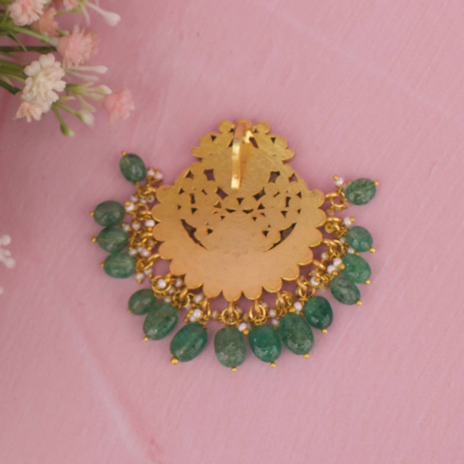 What sets this pendant apart is the combination of classic Jadau-Kundan craftsmanship with a modern, wearable silhouette. The green bead hangings provide a vivid contrast against traditional metal tones, making it distinctive from more conventional pendants. It’s an ideal centerpiece for those seeking a dramatic yet versatile accessory that can anchor multiple outfits and occasions.