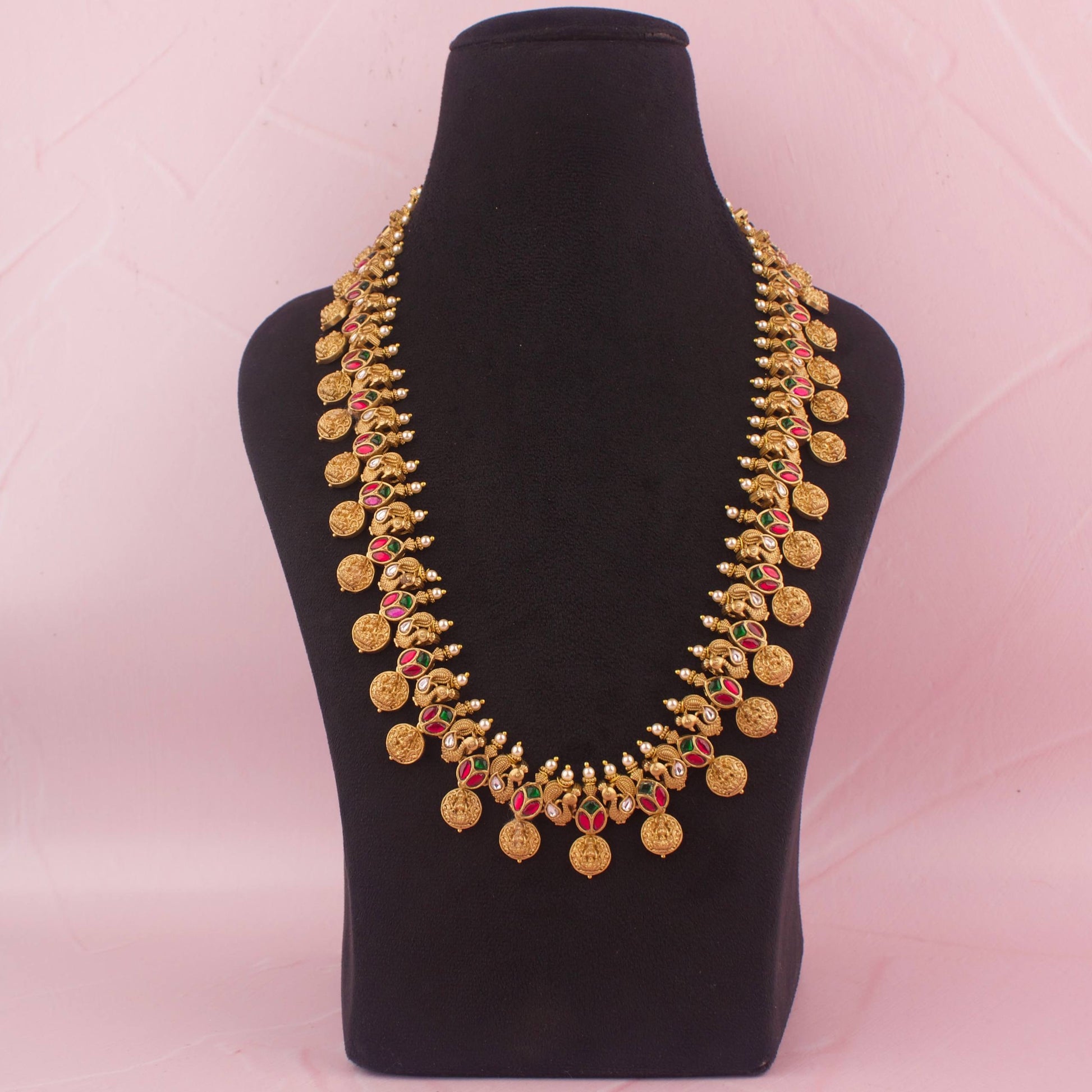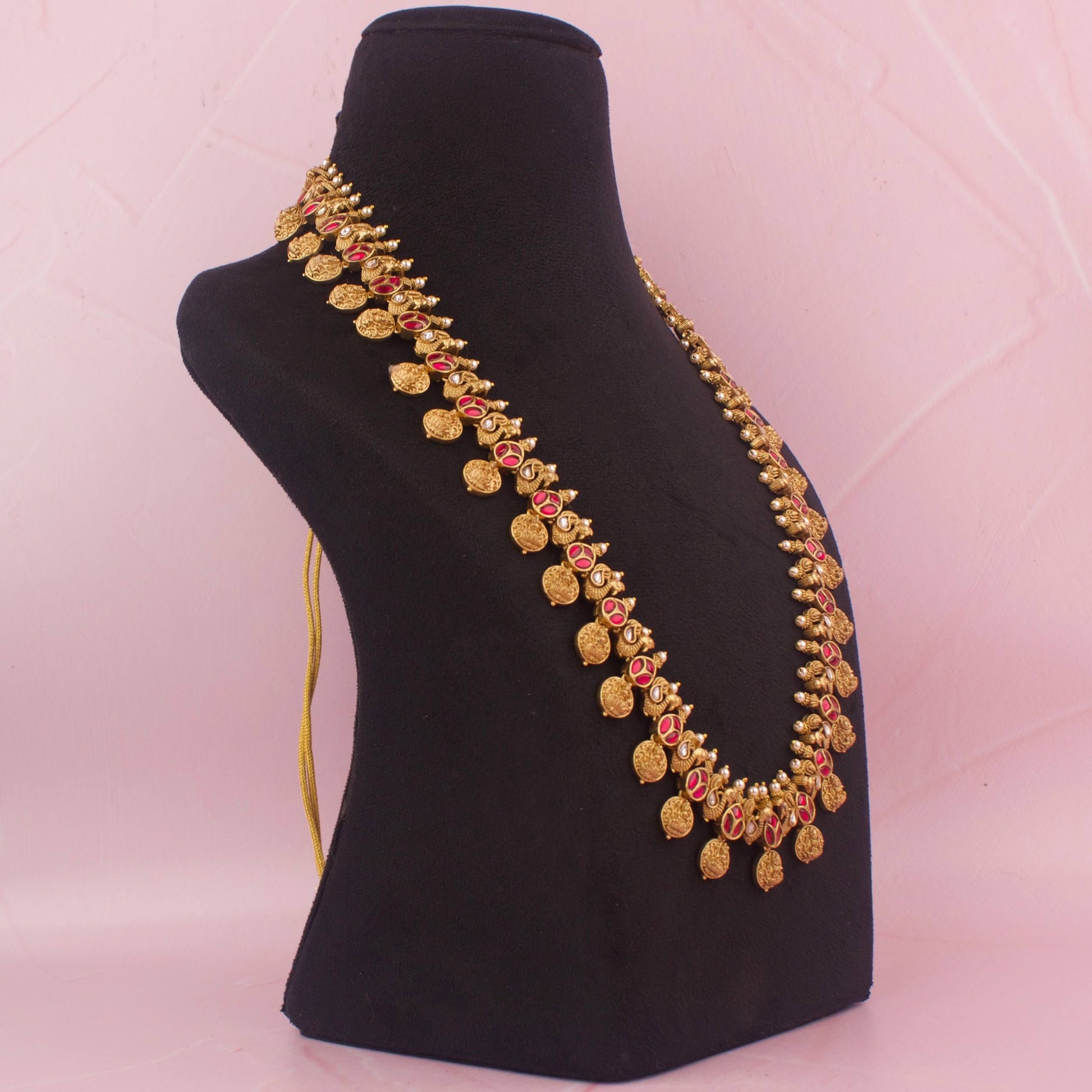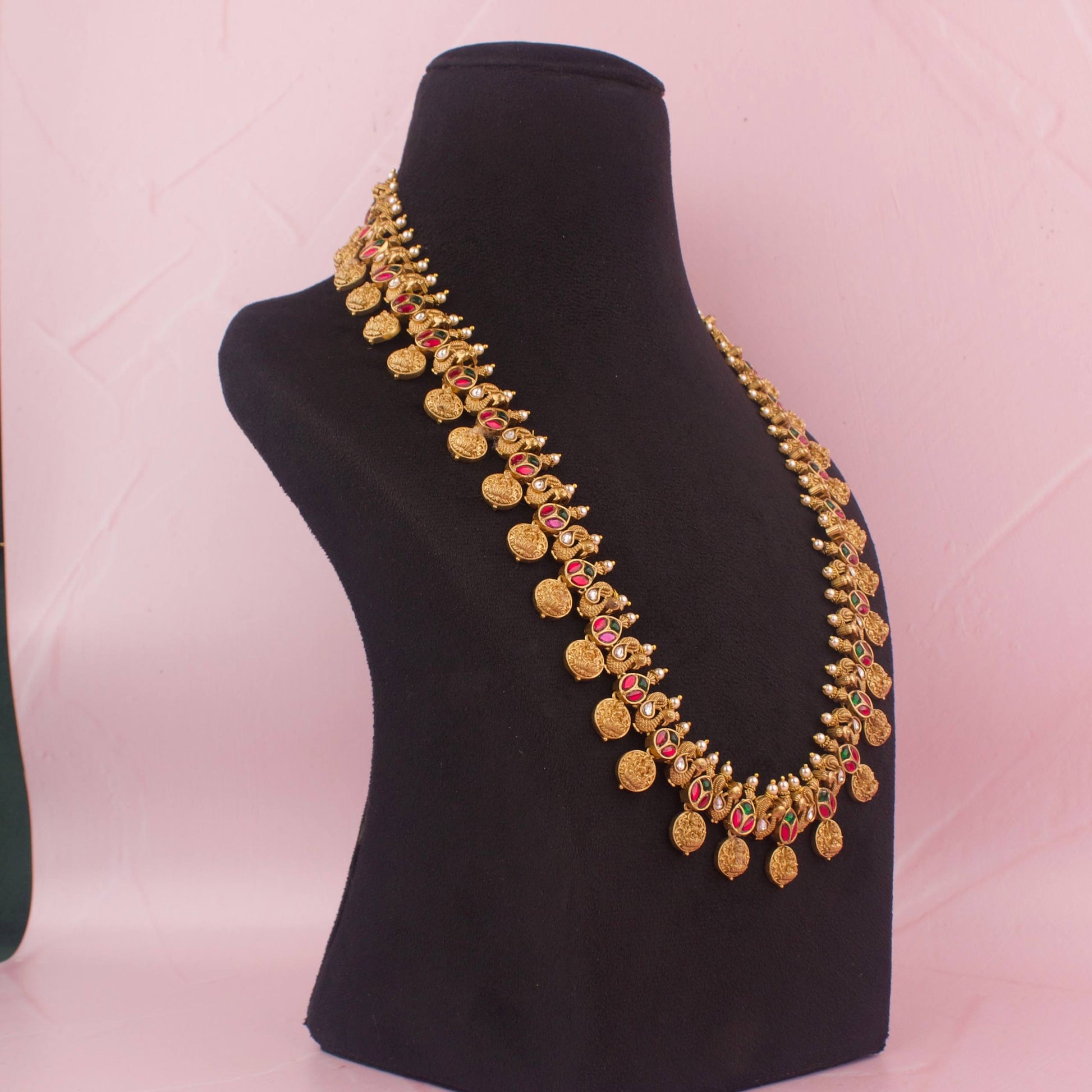 Discover the Jadau Kundan Nakshi Long Haram, a traditional Indian wedding necklace designed for brides, ritual celebrations, and jewelry lovers who value timeless craftsmanship. This long Haram blends Jadau artistry with Kundan settings and Nakshi detailing to create a centerpiece that enhances festive attire with cultural elegance.