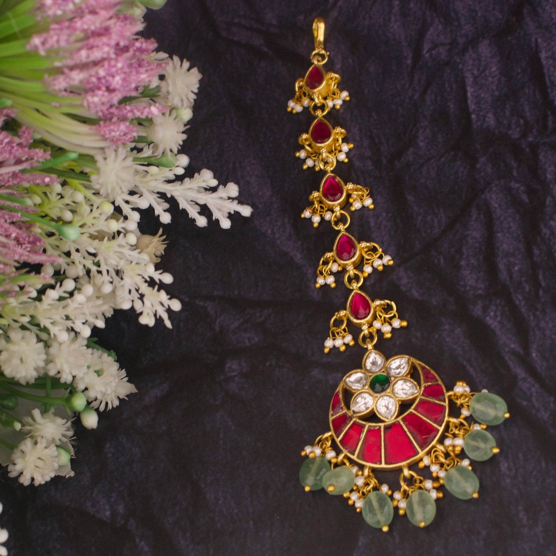 Designed to adorn the center of the forehead, the floral design captures romantic symmetry while the rich kundan stones catch the light from every angle. This piece is a versatile addition to bridal jewelry, pairing beautifully with lehengas, sarees, and other Kundan accents.