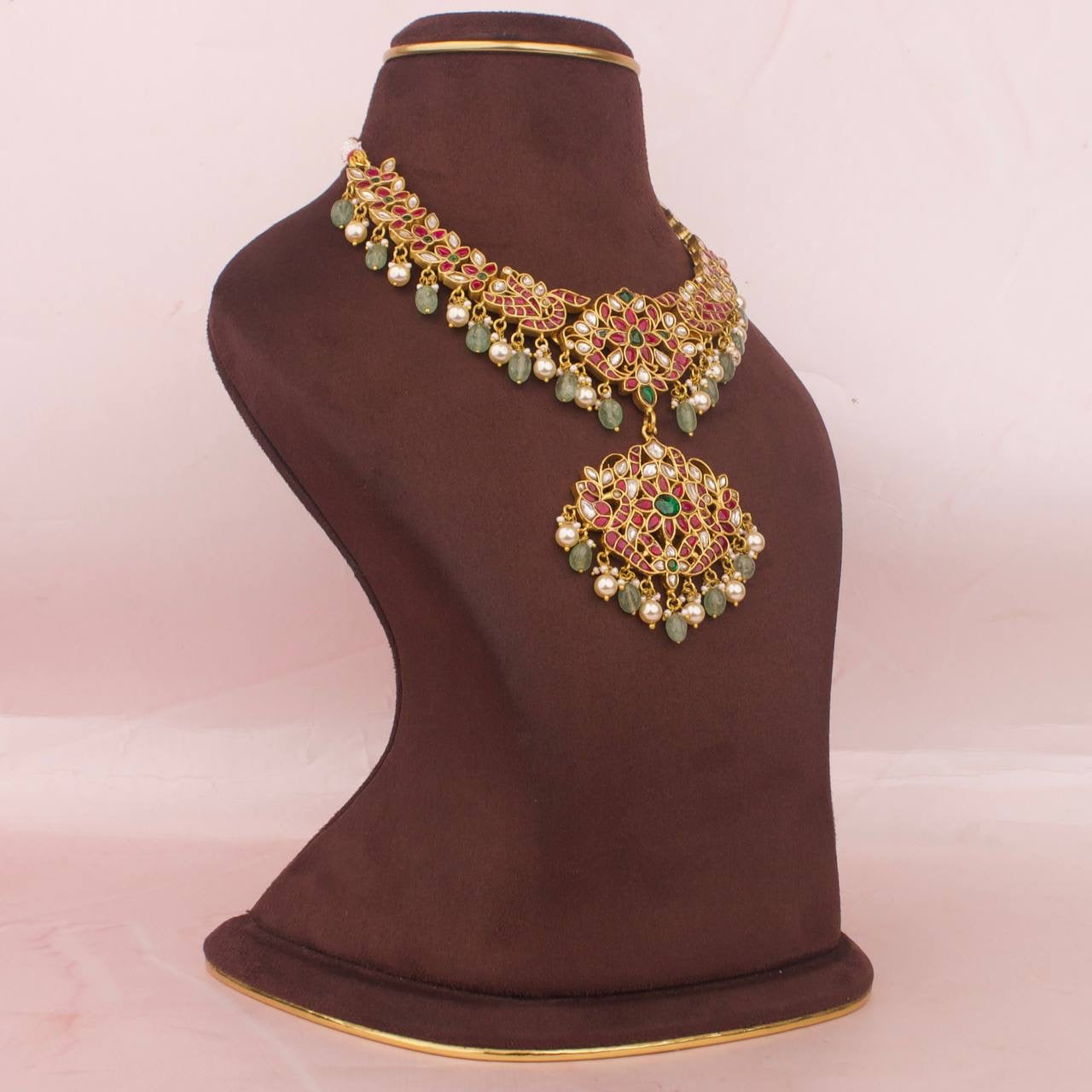 Multi Coloured Jadau Kundan Necklace With Pearl & Beads Hangings