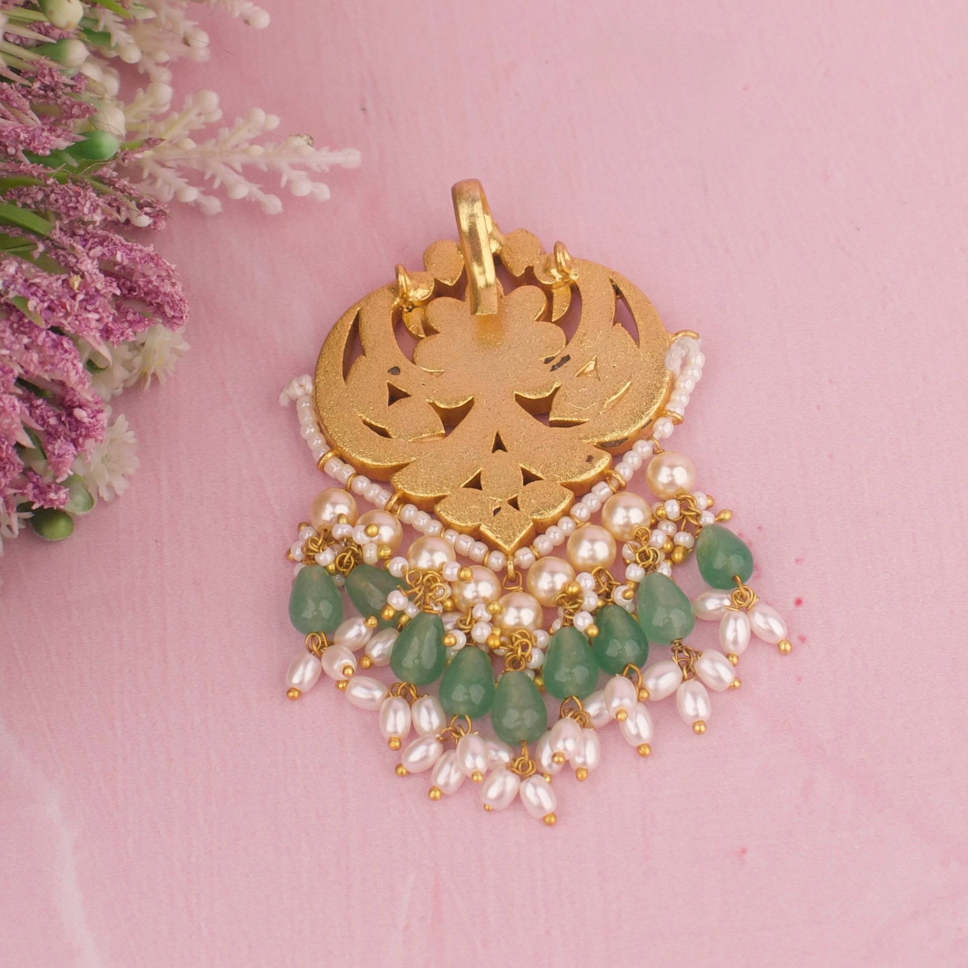 Discover a centerpiece piece of traditional craftsmanship with the Peacock Design Jadau Kundan Pendant featuring Guttapusalu hangings. Designed for those who celebrate culture and elegance, this pendant elevates bridal and festive ensembles with a regal focal point and graceful beadwork.