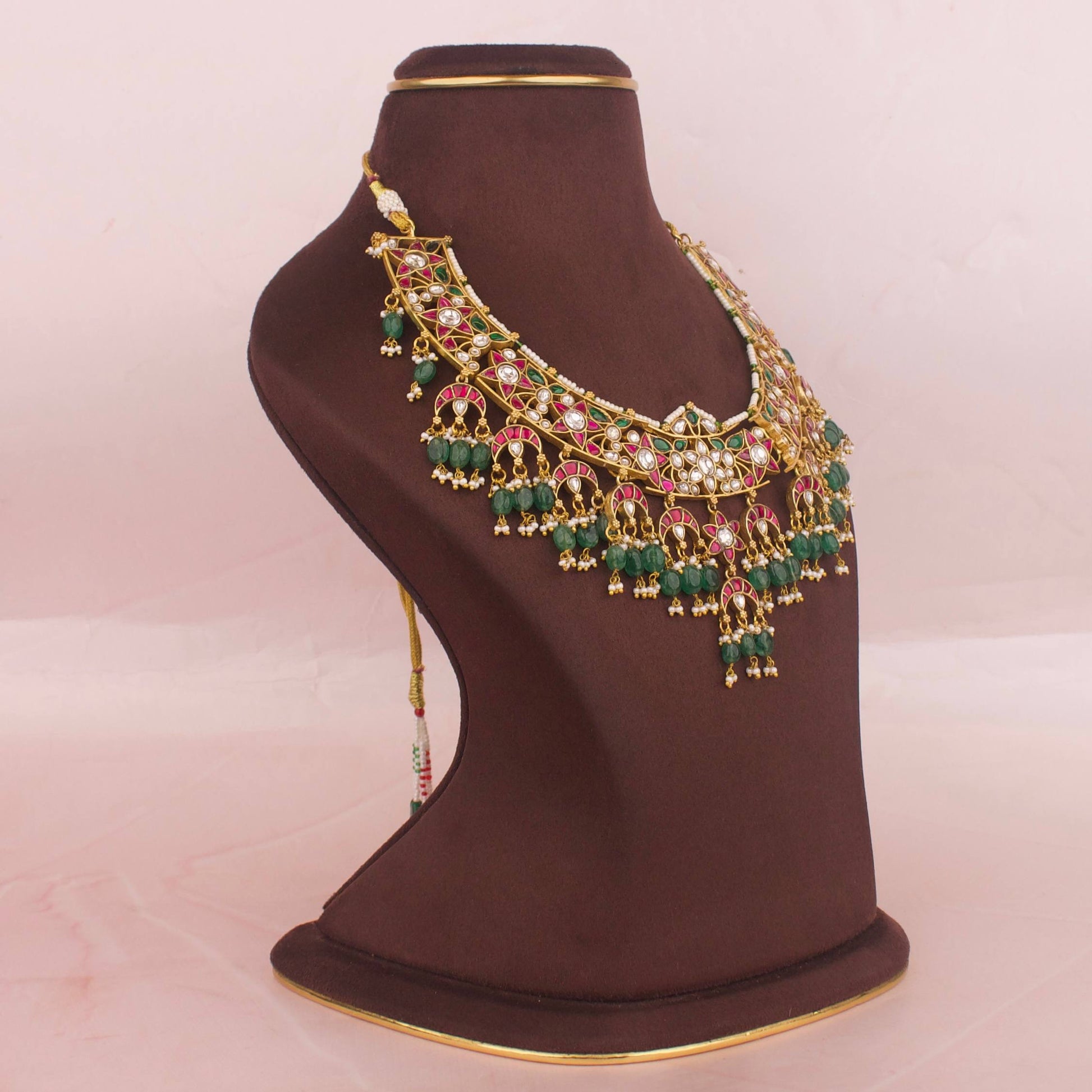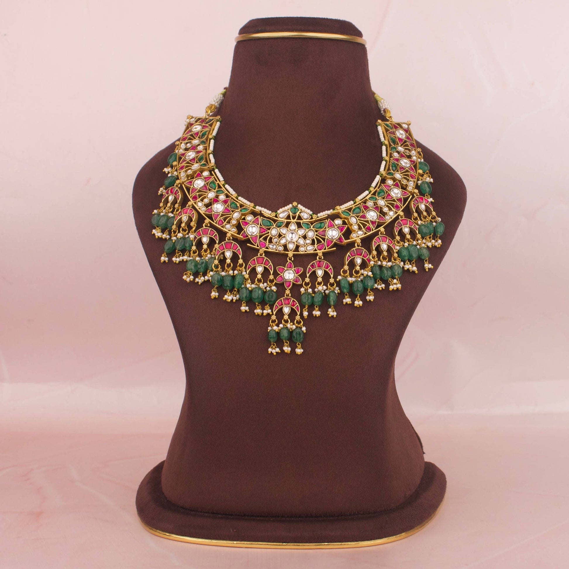 Featuring intricate kundan droplet hangings, this Statement Jadau Kundan Necklace blends regal Jadau artistry with a contemporary silhouette, making it ideal for bridal jewelry, weddings, festive events, and special occasions. Each bead catches the light, creating a captivating glow that turns heads from every angle.