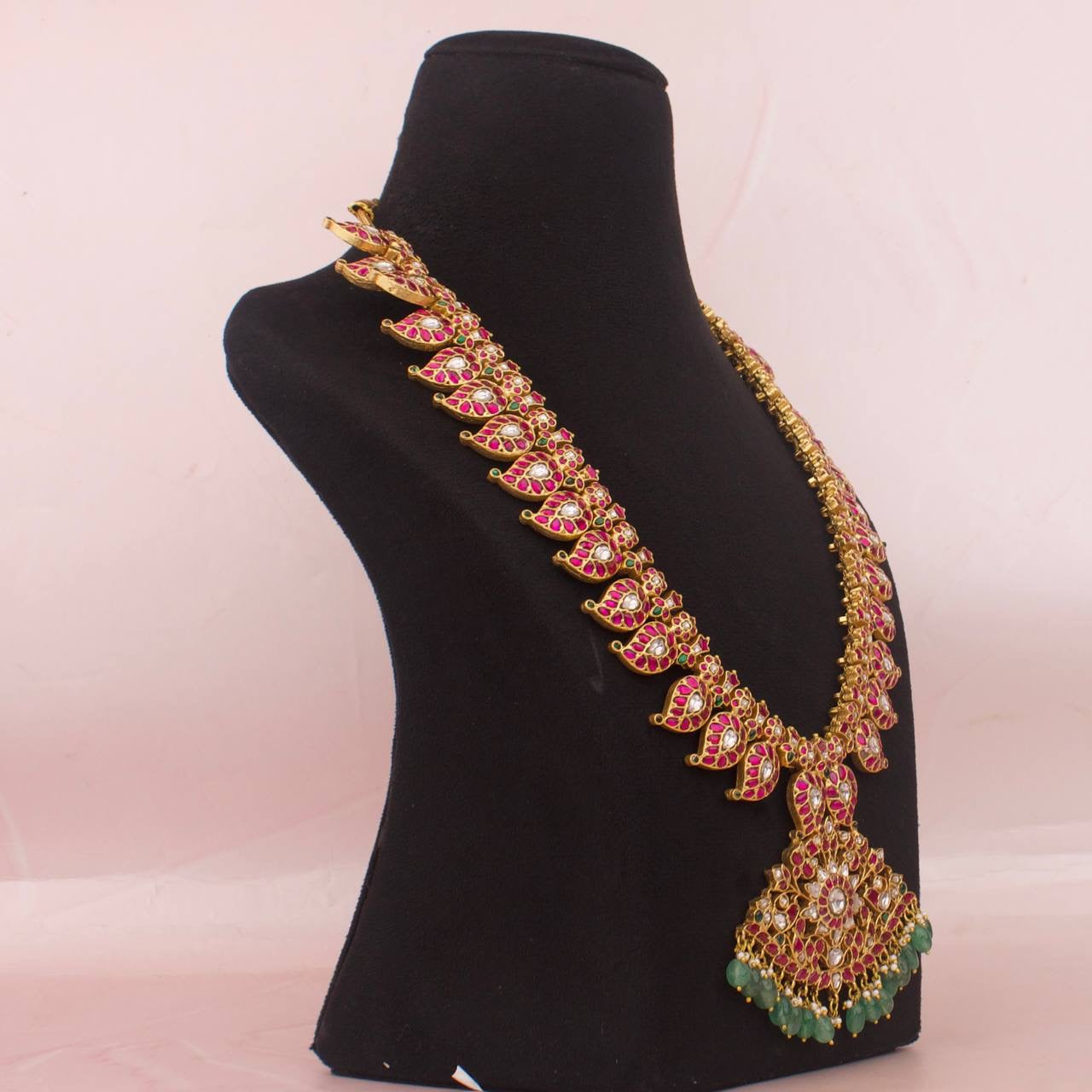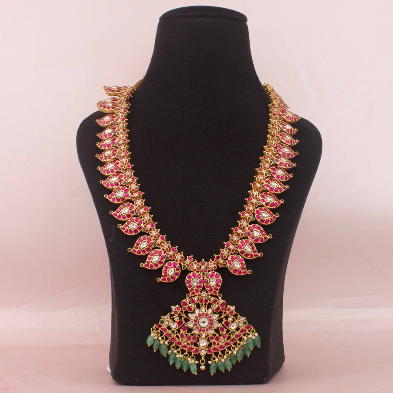 Designed in a Mango Haram silhouette, it captures the essence of traditional South Indian jewelry—bold, intricate, and destined to be the centerpiece of your ensemble. Every bead and setting reflects heirloom-worthy artistry, balanced for contemporary wear so you can shine with confidence at weddings, festivals, and special moments.