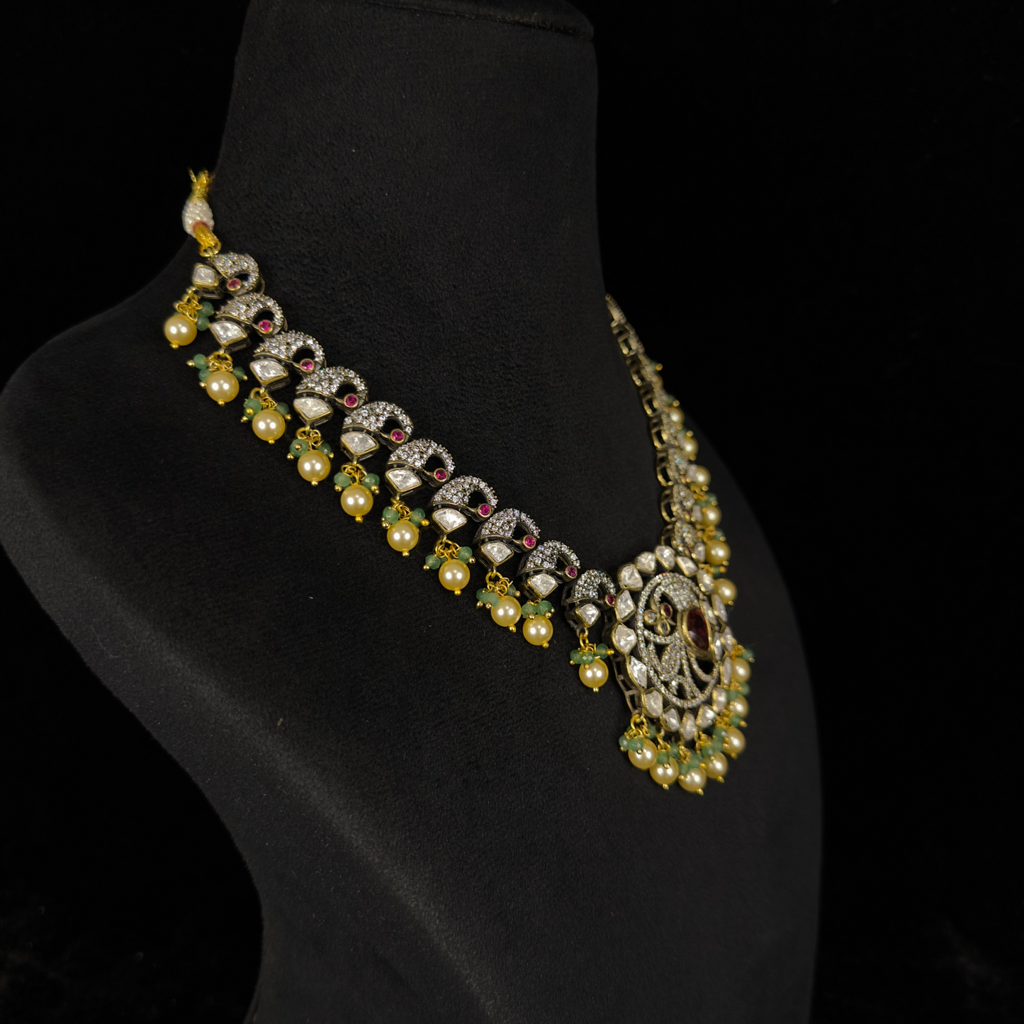 Immerse yourself in the splendor of our Victorian Peacock Necklace Set. This exquisite necklace features intricate designs adorned with premium zircon stones, Moissanite polki, and delicate pearls and beads, all set in a luxurious antique gold finish. The majestic peacock motifs add a touch of regal elegance, making it perfect for weddings and special occasions. Available in vibrant red, purple, and green variants, this set includes matching earrings, ensuring a complete and sophisticated look. Elevate your collection with this stunning necklace set, now available online.